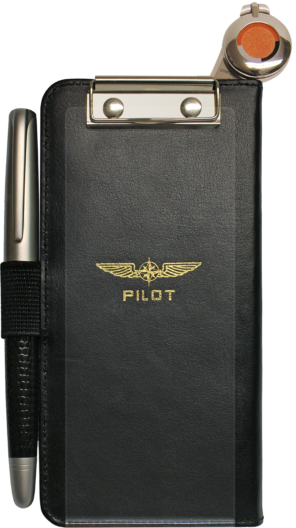 Elegant, high quality kneeboard is made of eco-friendly leather, suitable for mobile phones from 4"-5". Features a wide Velcro strap, holding clip, magnetic fastener, elastic penholder and a metal fixture for our PILOT CONTROLLER® KIT,.